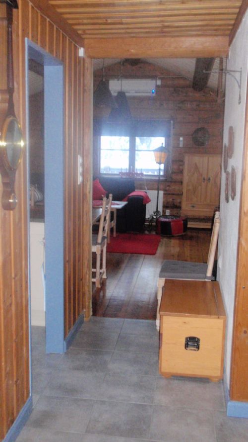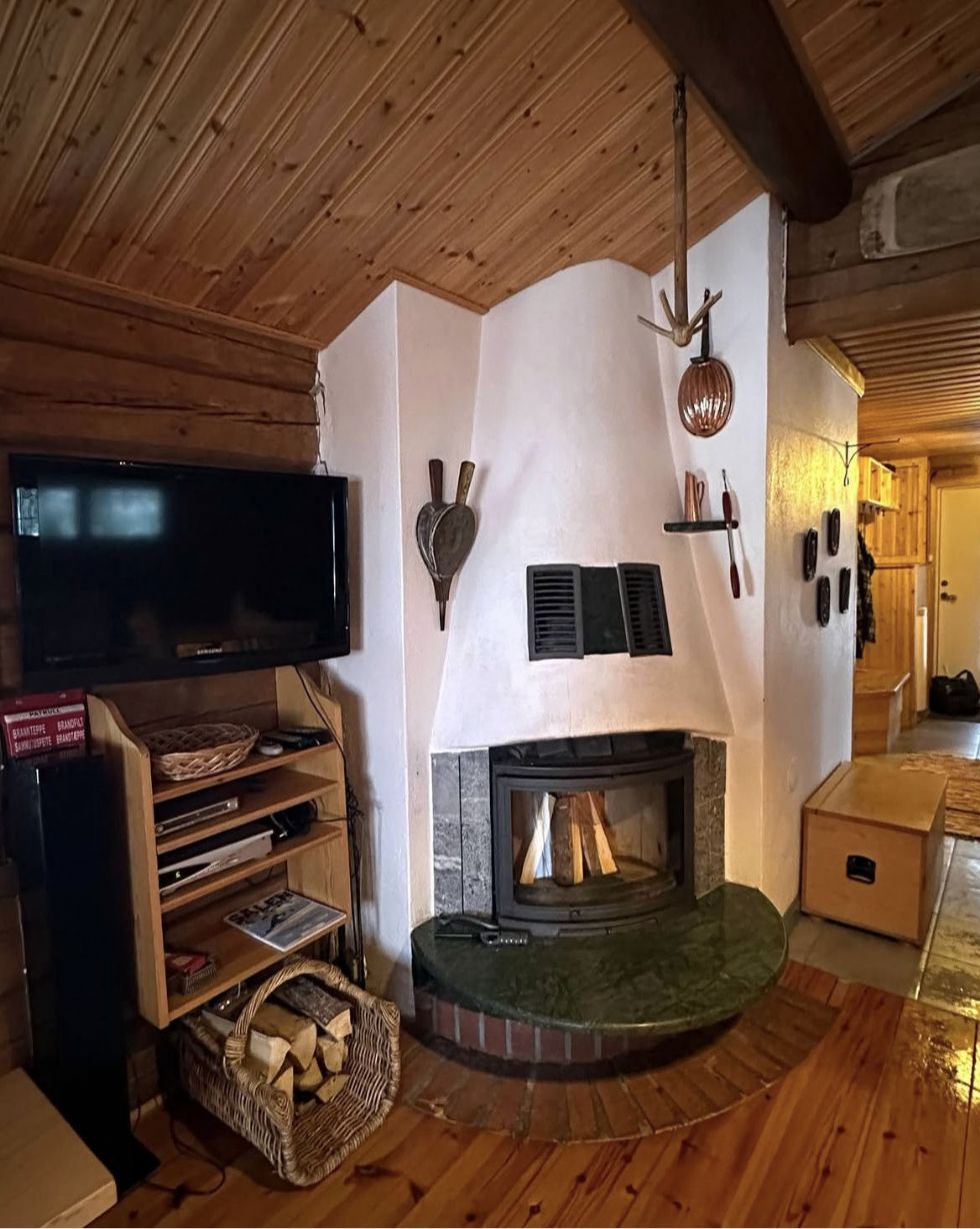 Storstugan är rymligoch mycket charmig med öppen spis samt att det är öppet i taknock.