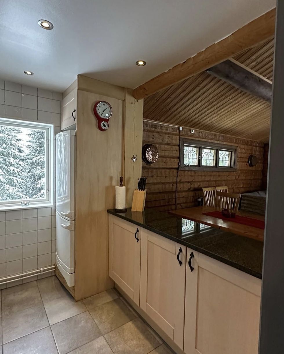 Köket är komplett och fräscht med kyl/frys, diskmaskin samt micro. Gott om matplatser i storstugan.