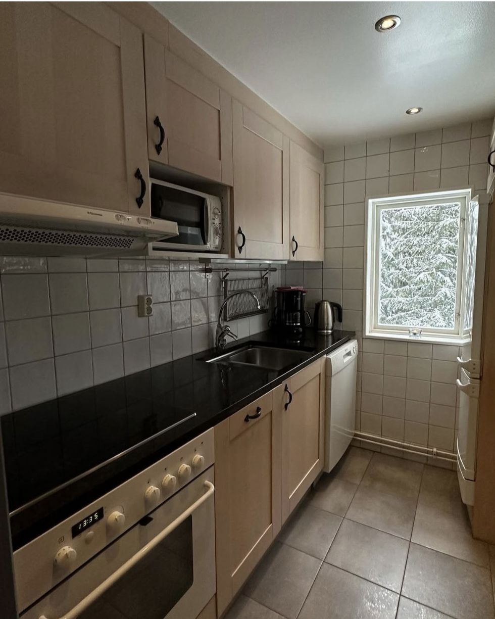 Köket är komplett och fräscht med kyl/frys, diskmaskin samt micro. Gott om matplatser i storstugan.