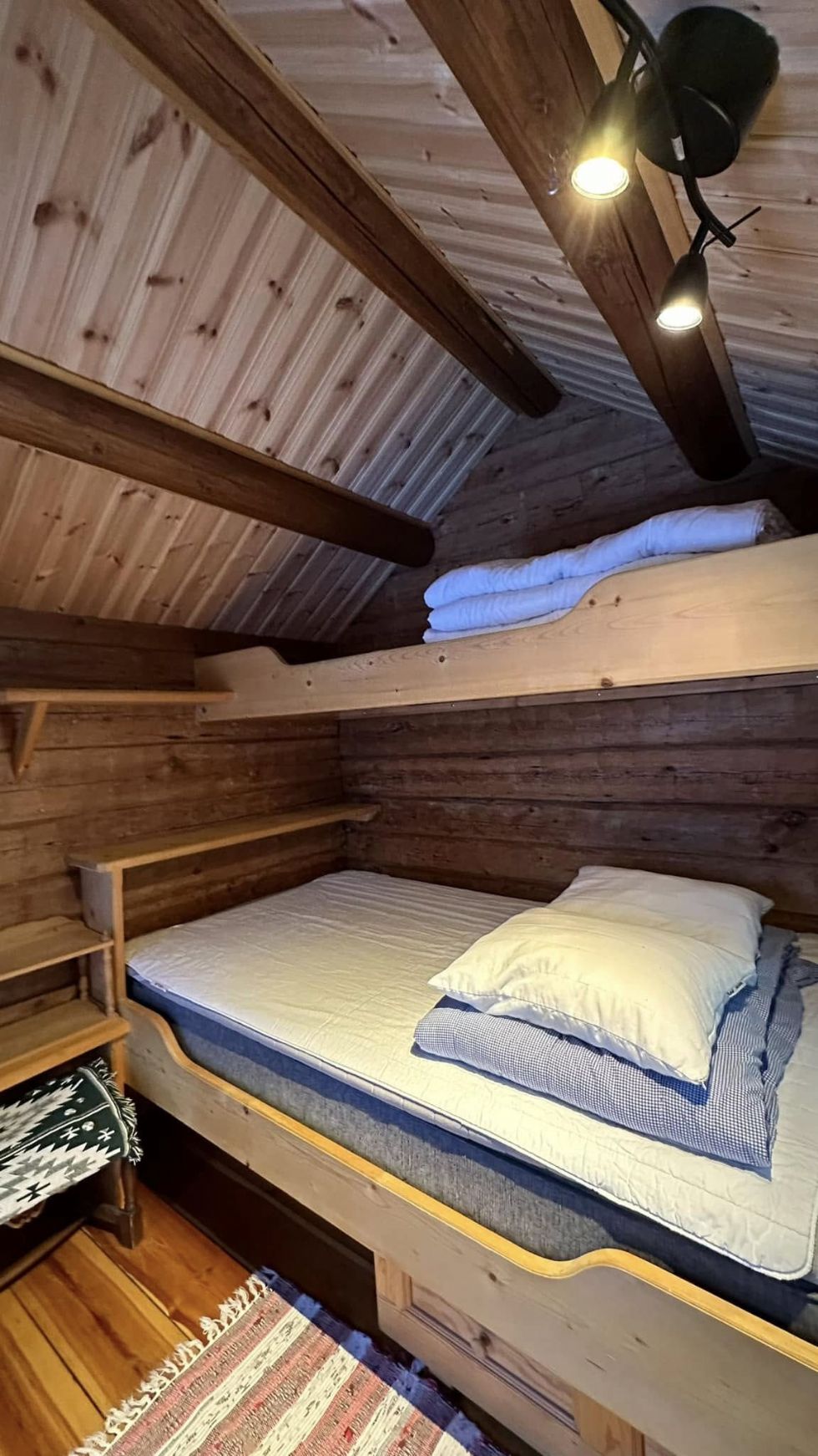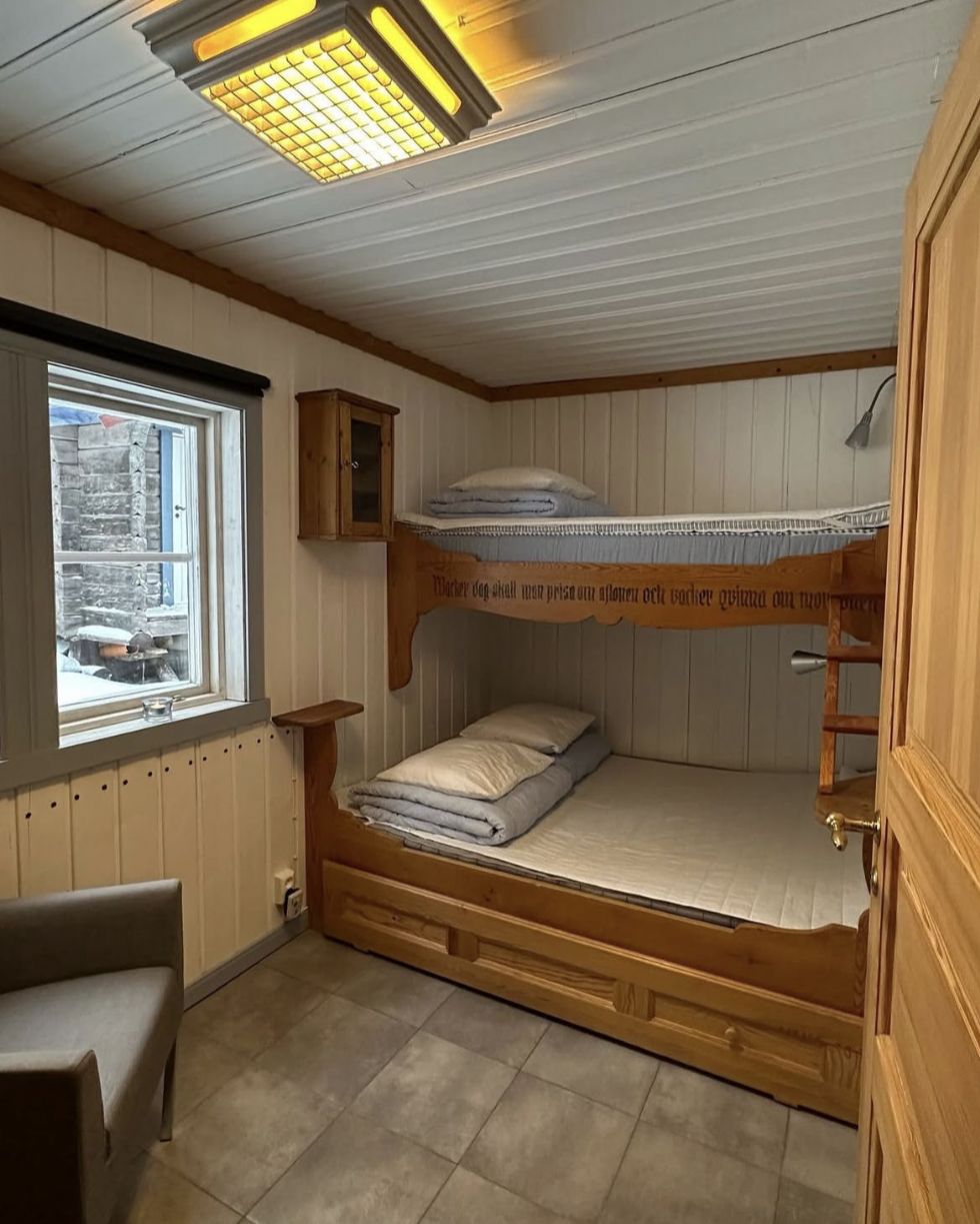 Till huset finns två mindre härbren. Det ena är ett jättemysigt sov härbre som vi också renoverat med ny våningssäng där underslafen är 120cm, nyslipat golv samt en söt liten gjutjärnskamin. Riktig mysfaktor!