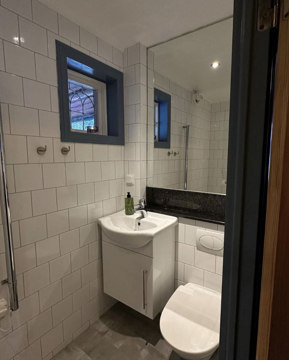 I huvudbyggnaden finns det en till dusch/toalett, även den är helkaklad.